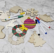 Our ready to go boxes contain laser cut wooden decorations, providing the perfect blank canvas for the kids to let loose. Each box of 6 or 10 comes complete with jute string to tie the decorations when ready plus a set of coloured pens, so just open and get colouring!